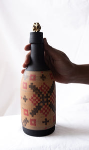 This sculptural bottle is wheel-thrown in black stoneware clay and finished with a hand-sculpted 23-carat gold knob that crowns the form. While fully functional—with a transparent glaze on the inside suitable for storing liquids—it is conceived primarily as a collectible, designed to sit comfortably at the intersection of function and statement décor.