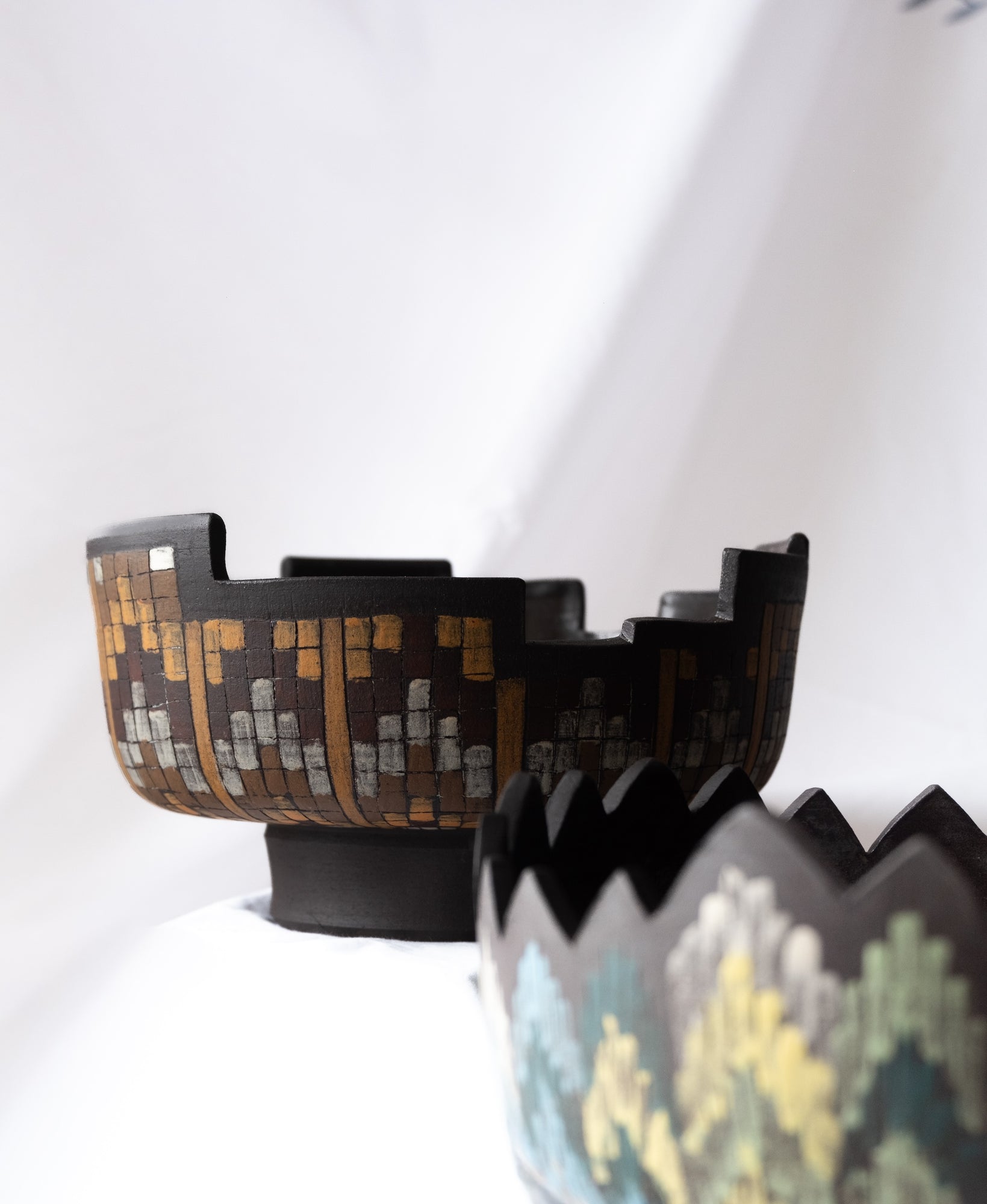 The surface work is inspired by Spanish Lenguas —repeating vertical flame-like motifs that move upward across the form. Their stepped ascent evokes the geometry of traditional stepwells, lending the bowl both its visual language and its name. The contrast of earthy tones against the dark clay body enhances the sense of depth and movement across the surface.